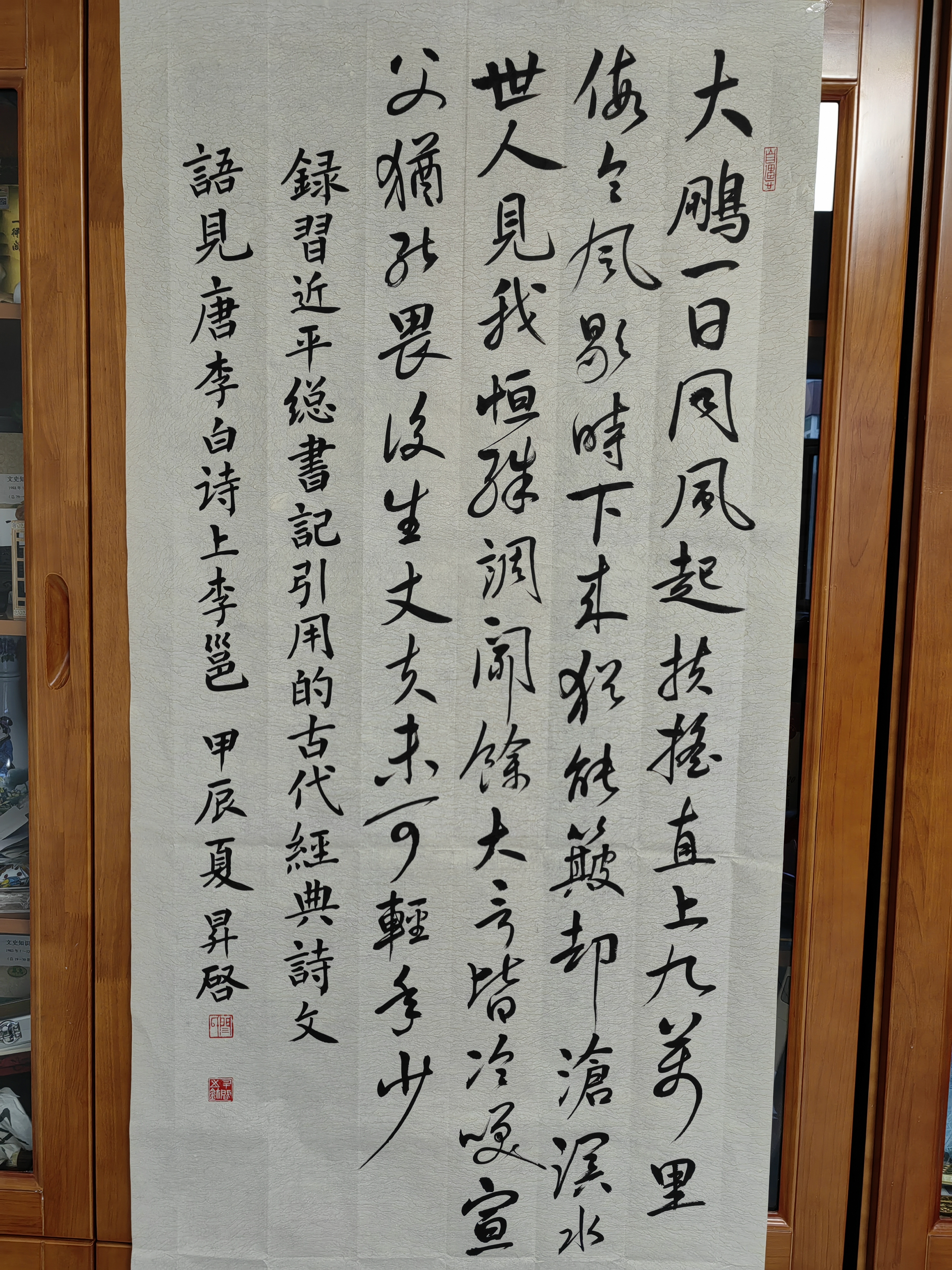 行書書法作品《上李邕》釋文:“大鵬一日同風(fēng)起,扶搖直上九萬里。假令風(fēng)歇時下來,猶能簸卻滄溟水。世人見我恒殊調(diào),聞余大言皆冷笑。宣父猶能畏后生,丈夫未可輕年少。”,
