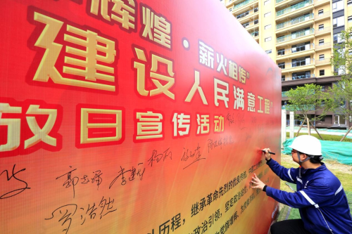 在辦實事、開新局環節,項目全體黨員在黨旗下重溫入黨誓詞,表示要踐行長征精神,建設人民滿意工程,更加堅定作為一名共產黨員的理想信念;活動中,中國二冶黨群工作部向黨員突擊隊和青年突擊隊授旗,各方代表表達了“踐行初心使命,認真履職盡責”的決心;全體職工簽下請戰書,紛紛表示將繼續充分發揚“一天也不耽誤,一天也不懈怠”的中冶精神,以求真務實、開拓創新的精神,把全部力量凝聚到項目建設中來,向成都市人民交出一份滿意的答卷,隨后,各方代表圍繞安全環保、項目建設、工程質量、工程進度等情況進行充分探討,對中國二冶董家埂社區工程的建設亮點進行深入了解。