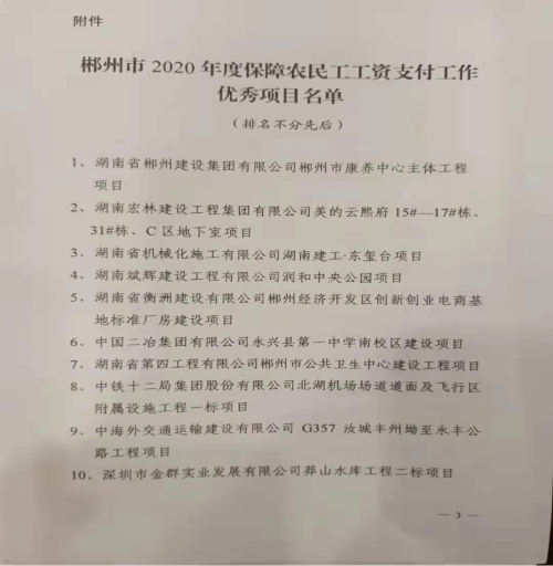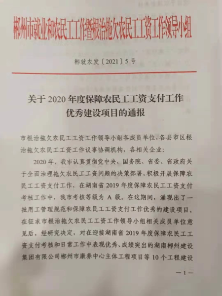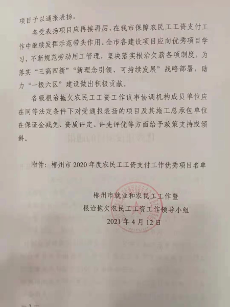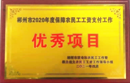 4月14日,中國二冶鋼構分公司湖南永興一中項目獲得2020年度湖南省郴州市保障農民工工資支付工作優秀建設項目榮譽稱號。