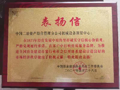 表揚信指出:中國二冶資產(chǎn)公司機械設(shè)備租賃中心在2021年經(jīng)營發(fā)展中始終堅持“誠實守信 合作共贏”核心價值觀,嚴(yán)格兌現(xiàn)履約承諾,在客戶中打響優(yōu)質(zhì)服務(wù)品牌,為推動全國冶金建設(shè)吊裝行業(yè)社會信用體系建設(shè)、營造良好市場經(jīng)濟秩序做出了積極貢獻。