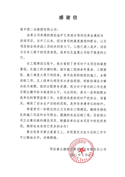 阿拉善左旗珠拉黃金開發有限責任公司向中國二冶致感謝信