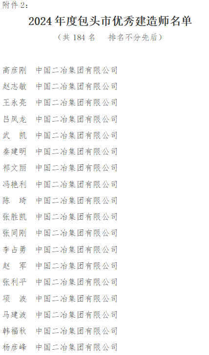 近日,包頭市住房和城鄉(xiāng)建設(shè)局通報(bào)表彰了全市2024年度建筑業(yè)優(yōu)秀施工企業(yè)、優(yōu)秀監(jiān)理企業(yè)及2024年度優(yōu)秀建造師、優(yōu)秀總監(jiān)理工程師。中國(guó)二冶獲評(píng)“2024年度包頭市建筑業(yè)優(yōu)秀施工企業(yè)”,同時(shí)30名職工獲評(píng)2024年度包頭市優(yōu)秀建造師,為公司榮譽(yù)榜再添佳績(jī)。