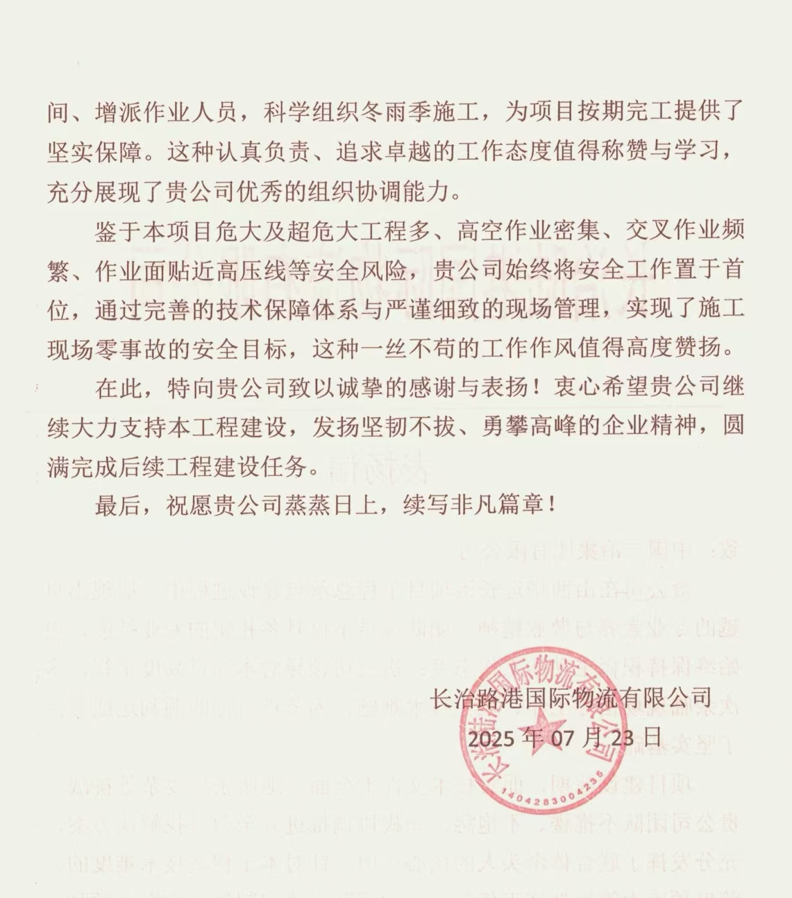 信中指出,工程自進場施工以來,貴公司領導對本項目高度重視,多次親臨現場指導工作、攻克技術難題,為節點目標的順利達成奠定了堅實基礎。在實施過程中,項目管理團隊攻克多項技術難關,保質保量按照計劃實現了預期目標,彰顯了項目團隊卓越的技術實力。特別是施工關鍵時期,由于本項目存在危大及超危大工程多,高空作業密集,交叉作業頻繁等安全風險,為此,項目管理團隊始終將安全工作置于首位,通過完善的技術保障體系與嚴謹細致的現場管理,實現了施工現場零事故的安全目標。