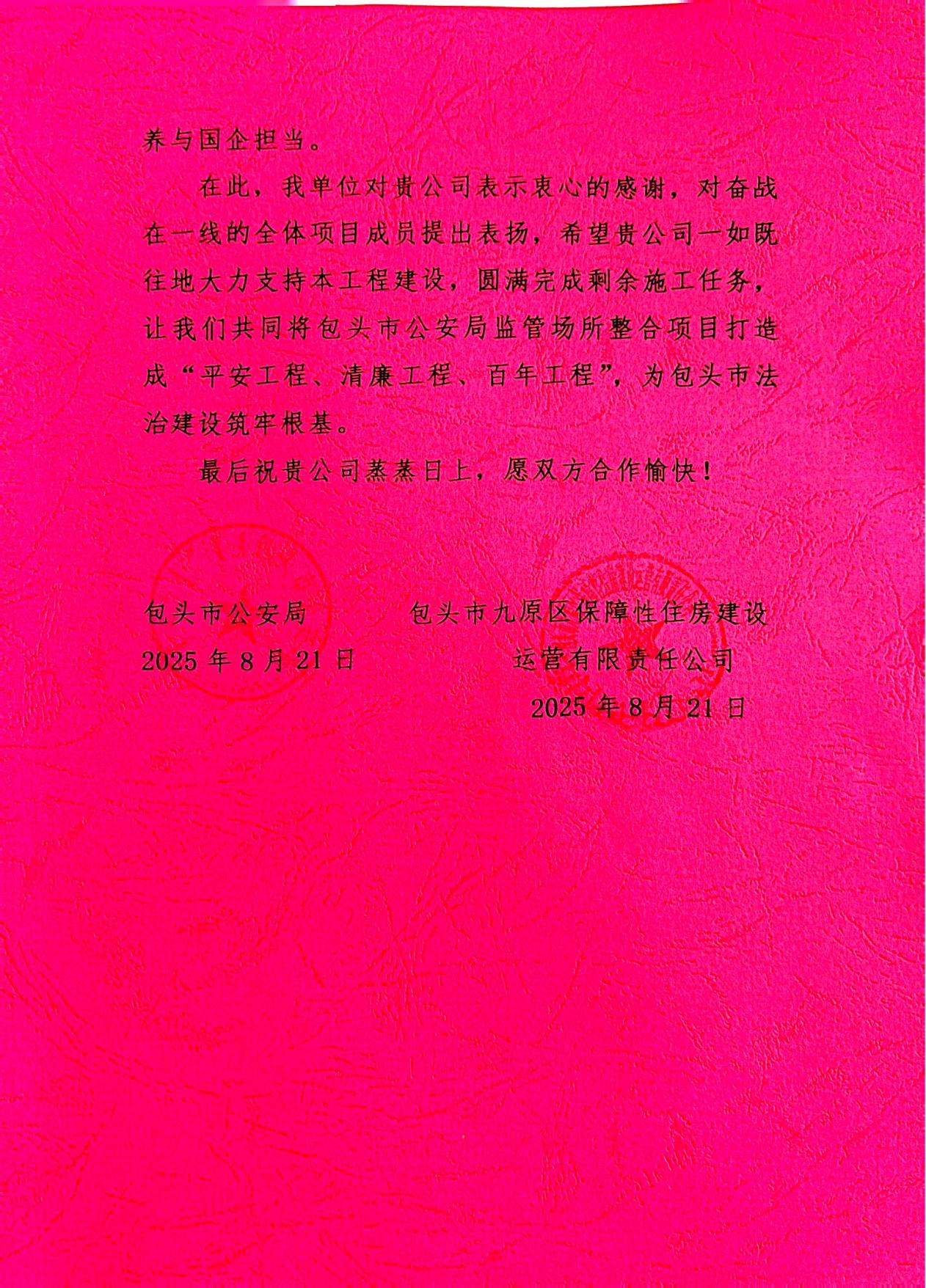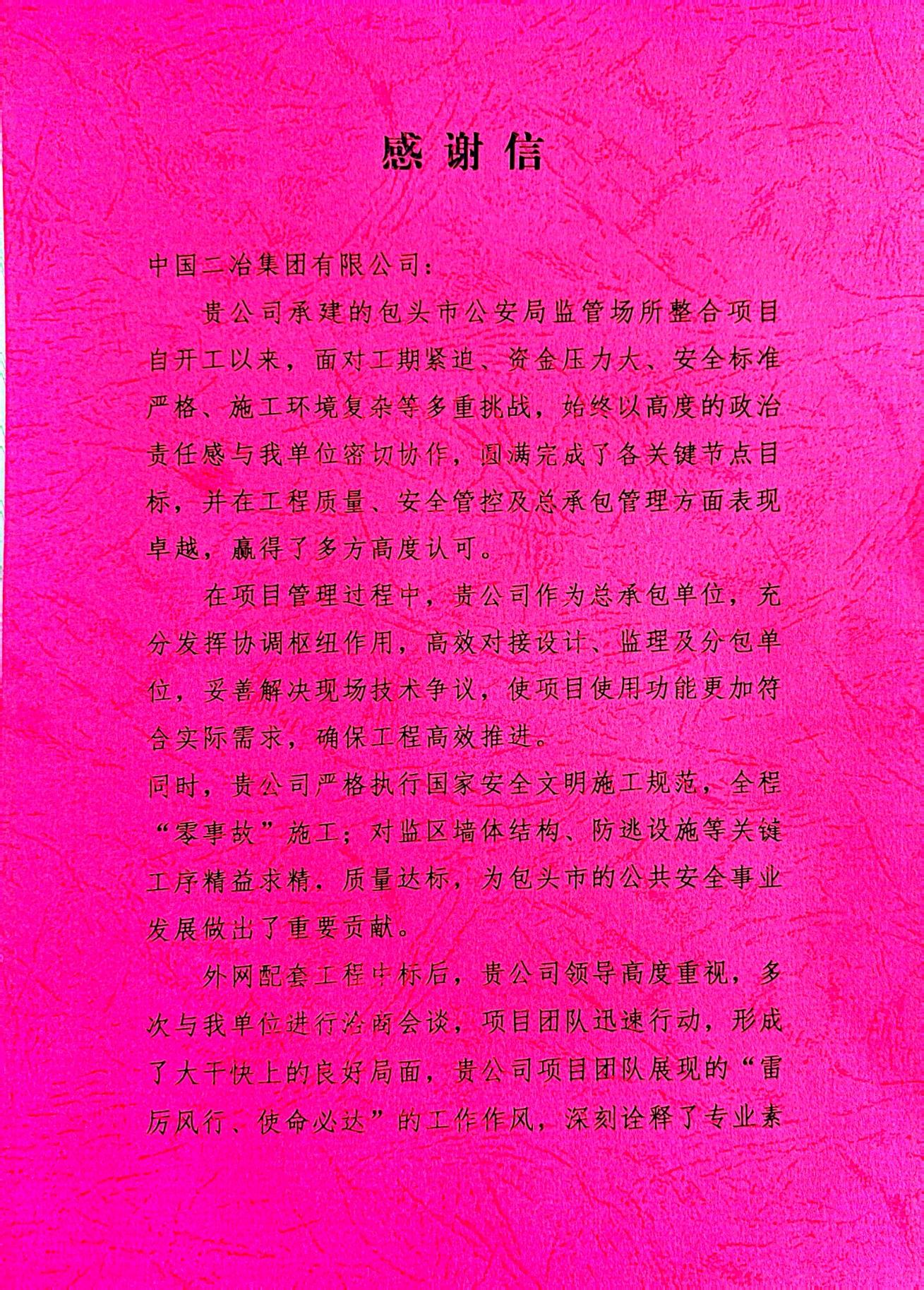 信中指出,貴公司作為總承包單位,充分發揮協調樞紐作用高效對接設計、監理及分包單位,妥善解決現場技術爭議,使項目使用功能更加符合實際需求確保工程高效推進。同時嚴格執行國家安全文明施工規范,全程“零事故”施工;對監區墻體結構、防逃設施等關鍵工序精益求精質量達標,為包頭市的公共安全事業發展做出了重要貢獻。今年,在外網配套工程中標后,貴公司第一時間響應,相關領導高度重視,多次與我單位進行洽商會談項目團隊迅速行動,人、材、機第一時間到位,形成了大干快上的良好局面項目團隊展現的 “超越自我、挑戰極限”的作風,以及使命必達的執行力,深刻詮釋了專業素養與國企擔當