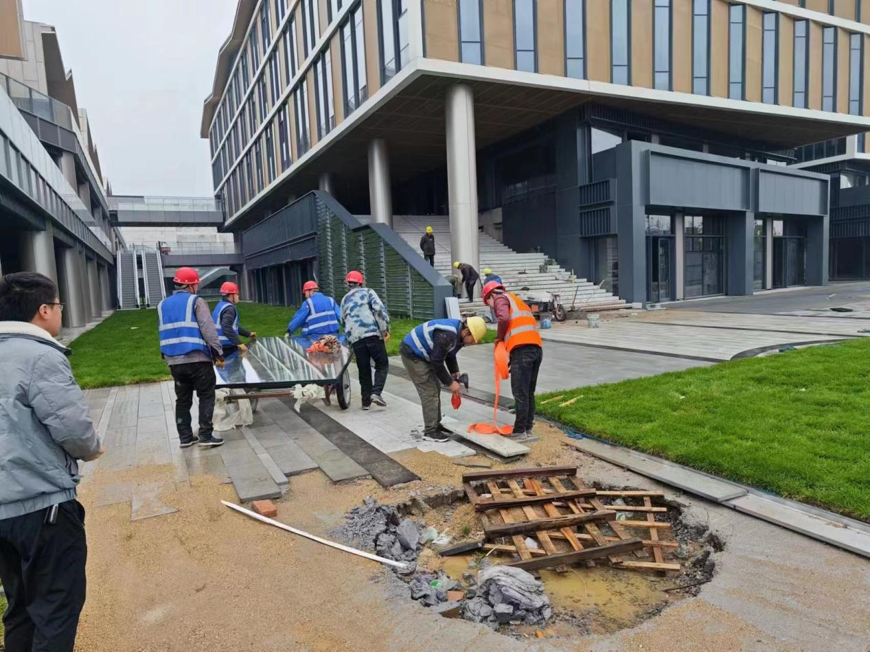 在如意東路便民服務中心項目施工現場,項目負責人帶頭加班加點、爭分奪秒投入項目工作中。目前主體工程已全部完成,道路硬化完成,幕墻工程、水電安裝工程、消防安裝工程、精裝工程、景觀工程均在收尾中。確保進度的同時項目部細心施工,精益求精,堅持將安全文明施工落實到位,全力保障竣工驗收,確保雙過半。