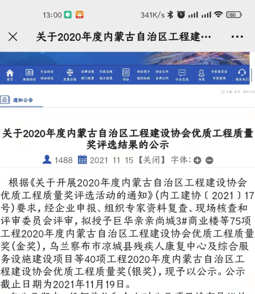 鋼構分公司一項工程獲內蒙古工程建設優質工程金獎